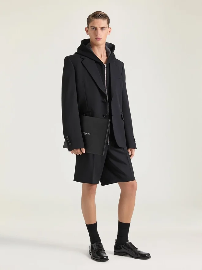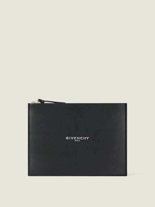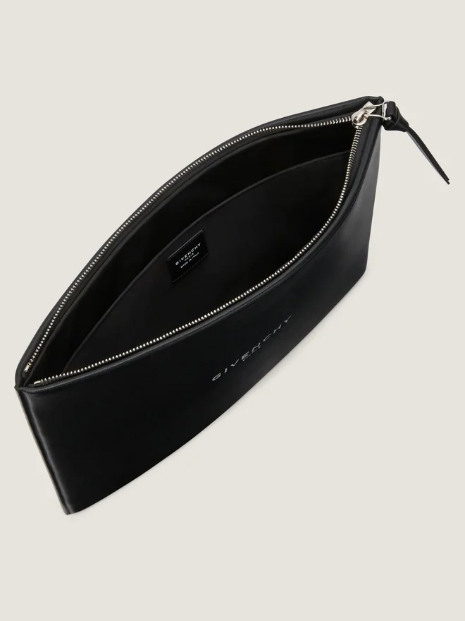 Large Pouch in Padded Calfskin Leather. Antigona Stamped Line. Zipped Closure with Leather Zipper Pull. Silvery Givenchy Paris