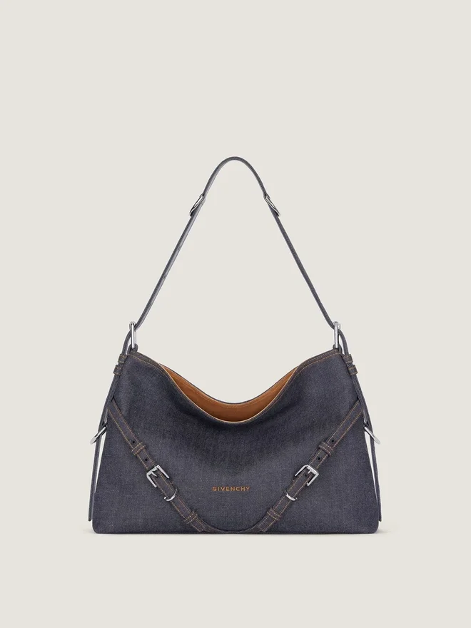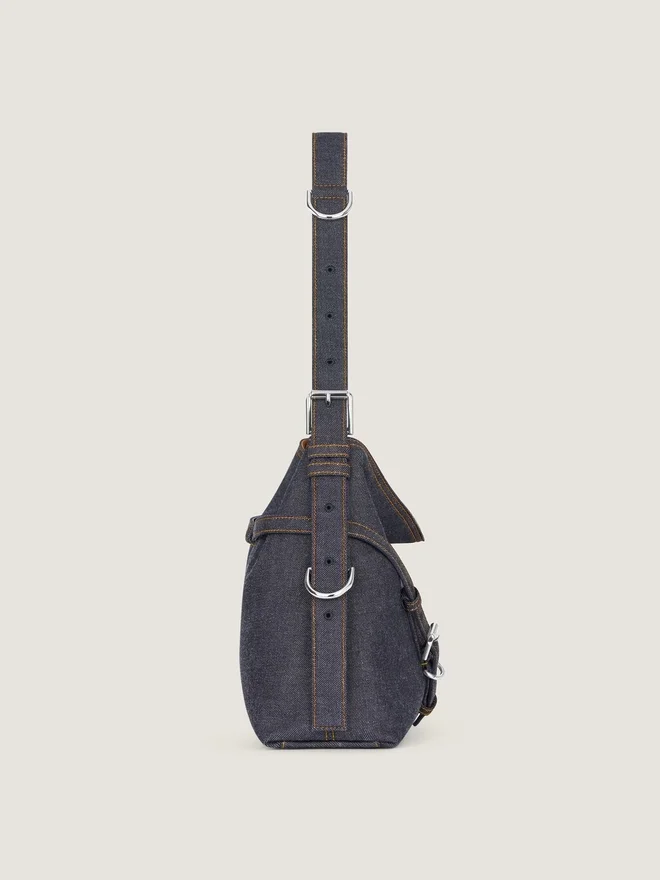 Medium Shoulder Bag in Denim with Contrasting Stitchings. Voyou Line. V-Shaped Slouchy Silhouette and Generous Volume. Adjustable