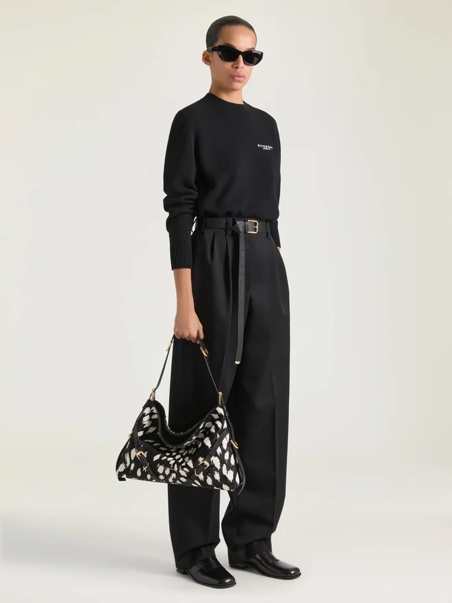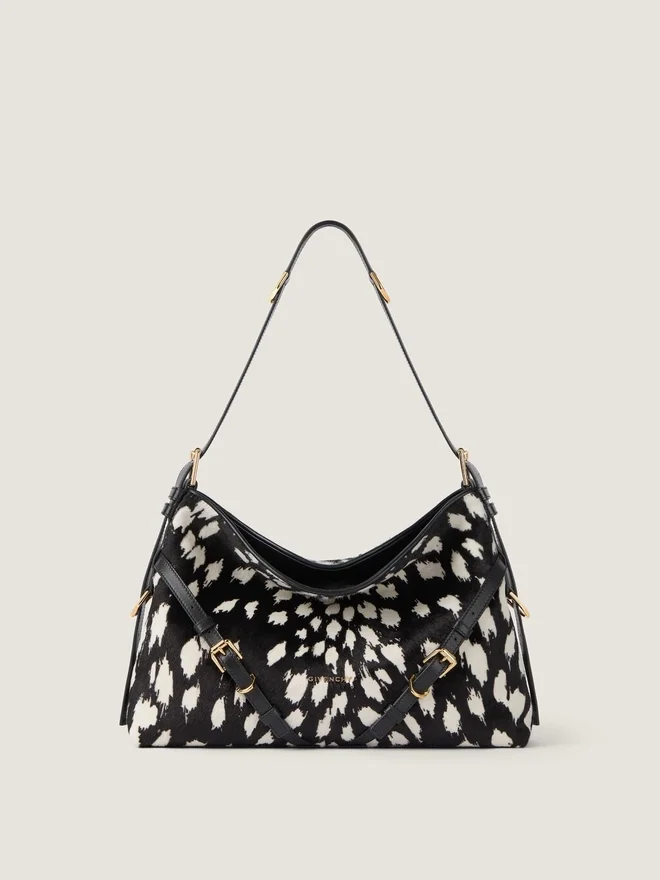 Medium Shoulder Bag in Pony Effect Calfskin Leather with Snow Leopard Pattern. Voyou Line. V-Shaped Slouchy Silhouette and