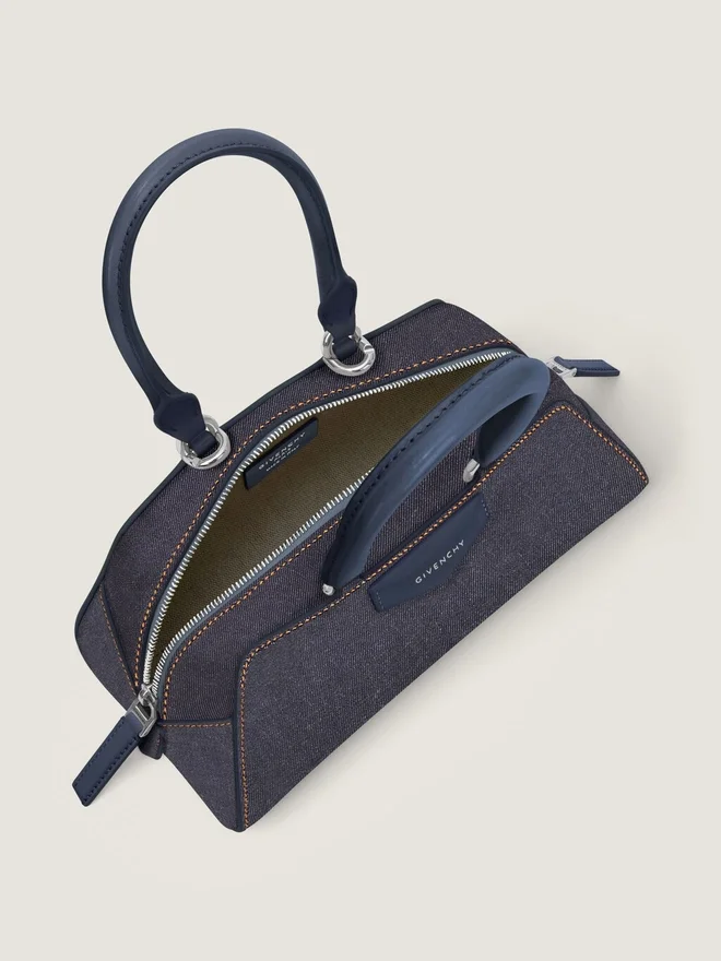Mini Bag in Denim Avec SurpiqûRes ContrastéEs. Antigona Line. Long East-West Shape with Origami-Style Gusset Construction. Zipped