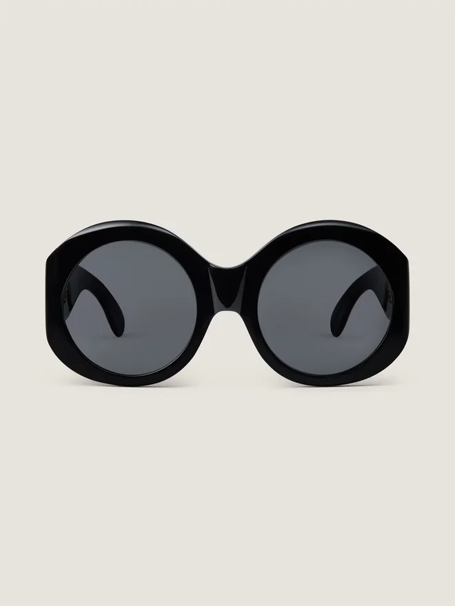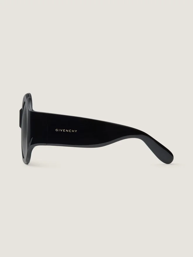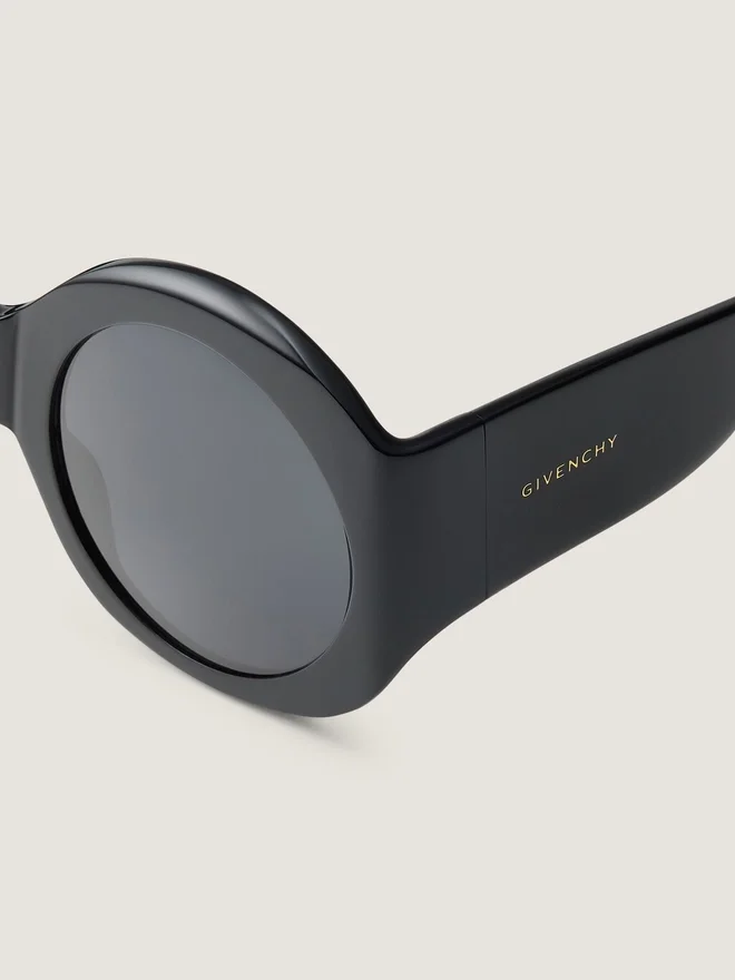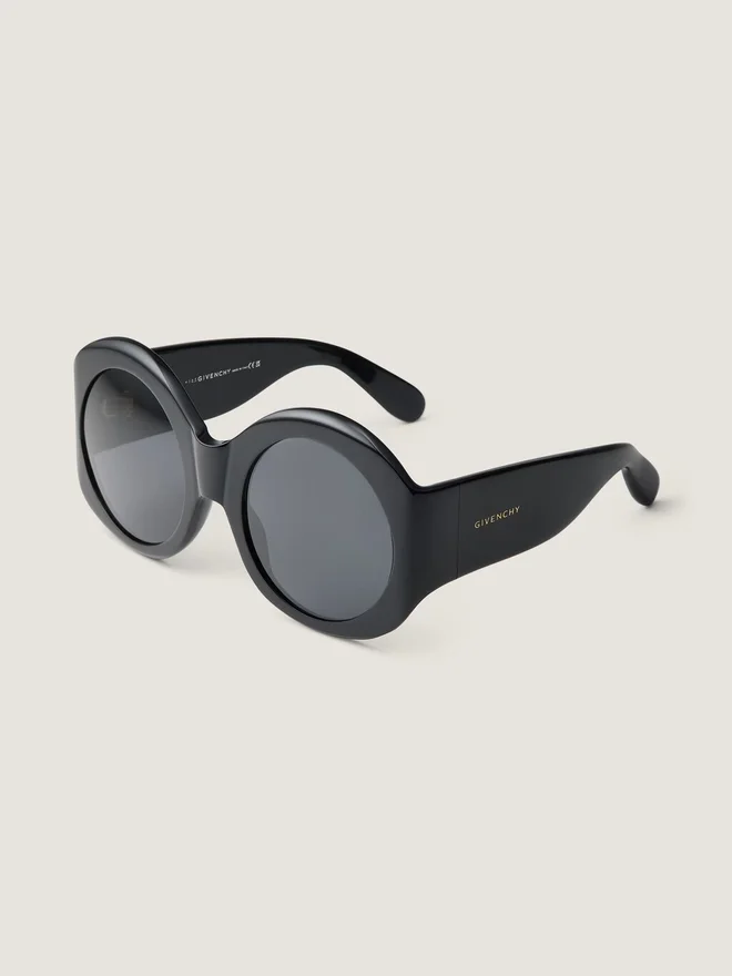 Sunglasses in Acetate. Cocoon Line. Round Cocoon Shape with Large Temples. Smoke Lenses. Golden Givenchy Signature Engraved on