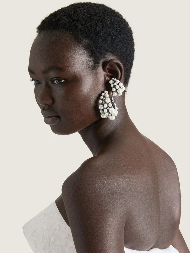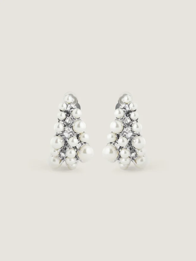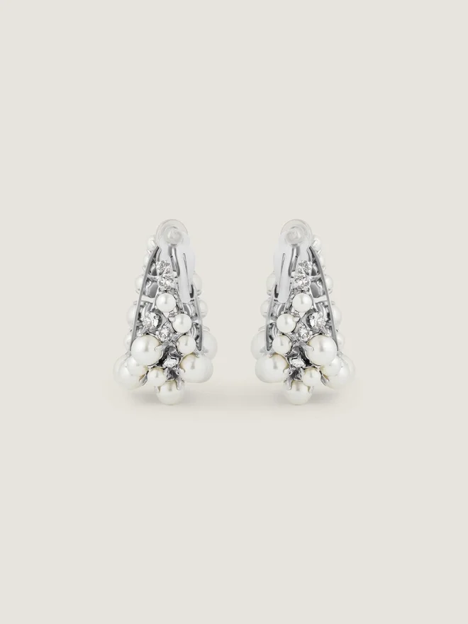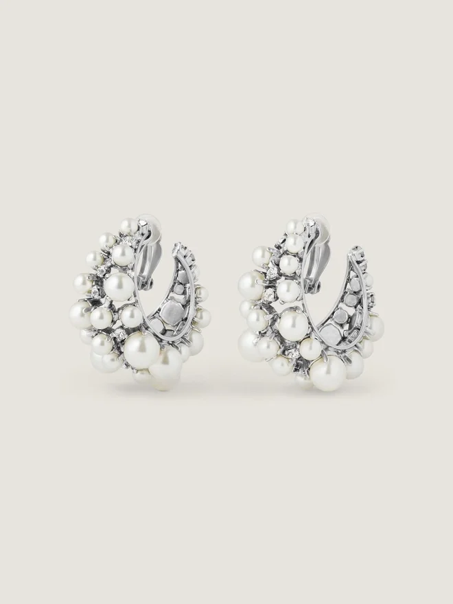- Clip Earrings in Silvery-Finish Metal with Hand-Set Crystals and Pearls.