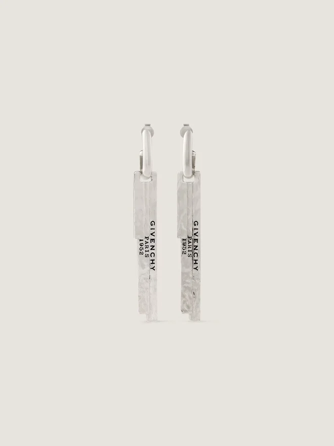Pendant Earrings in Silvery-Finish Textured Metal. Givenchy Tape Line. Givenchy Paris 1952 in Black Enamel on the Front. Givenchy