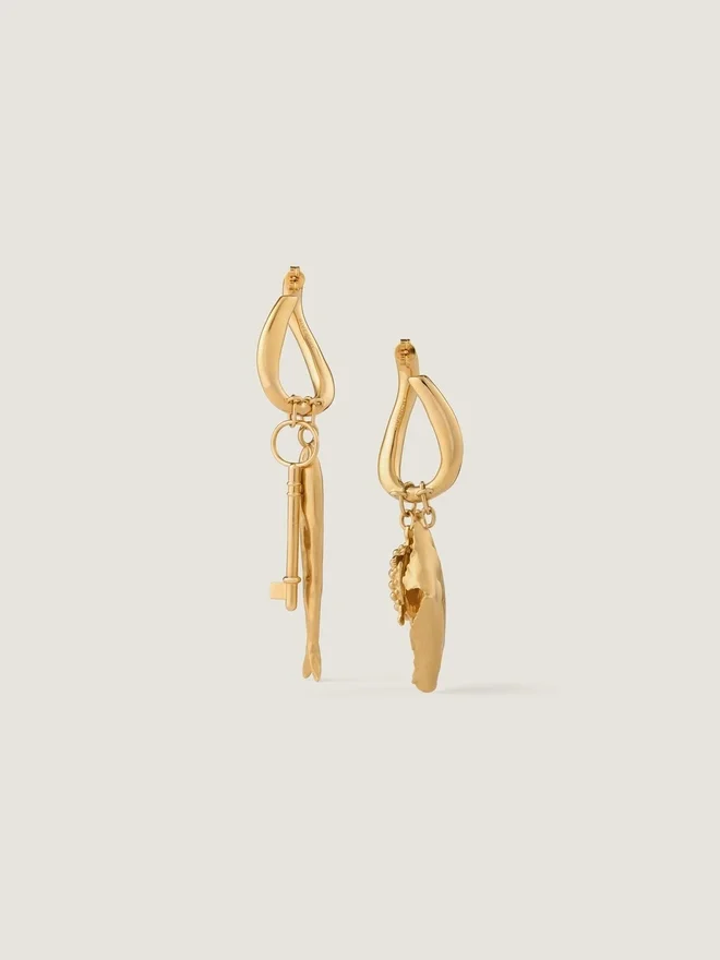 Asymmetric Earrings in Golden-Finish Metal. Lucky Charms Line. Unfixed Charms Inspired from Hubert De Givenchy’s Objects:
