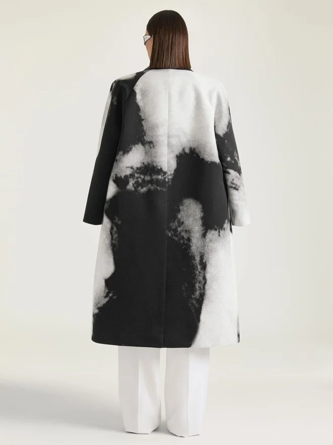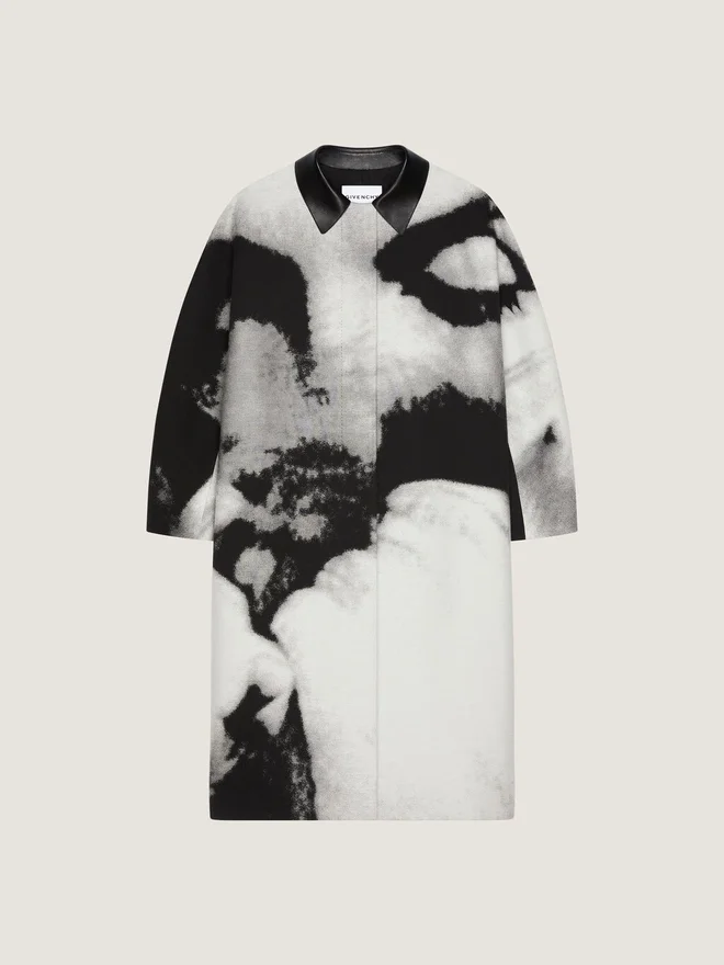 Car Coat in Cotton with Portrait Jacquard. Classic Leather Collar. Hidden Button Closure. Two Side Pockets. Model Measures 5.8