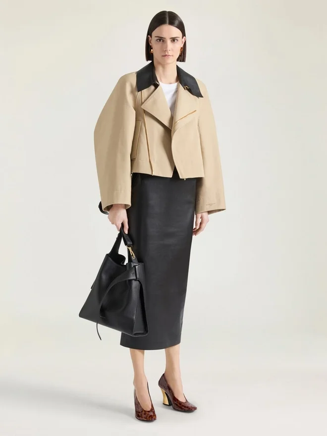 Cropped Peacoat with Leather Collar in Cotton and Wool