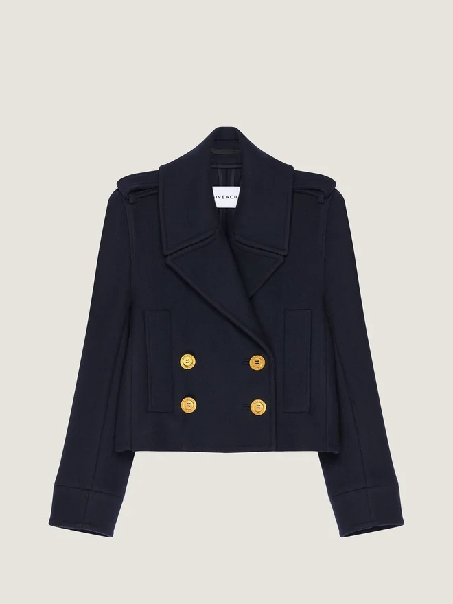 Short Pea Coat in Wool. Notch Lapel. Double Breasted. Givenchy Engraved Golden Buttons. Two Side Pockets. Volume in the Back.