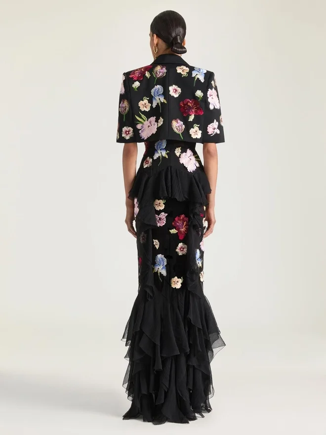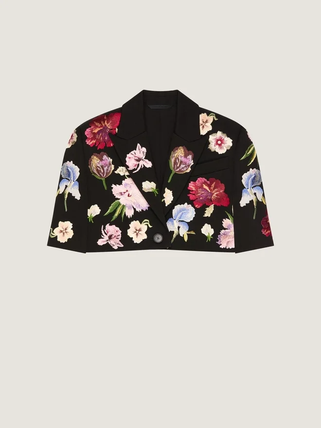 - Short-Sleeved Jacket in Grain De Poudre Wool with Floral Embroideries.