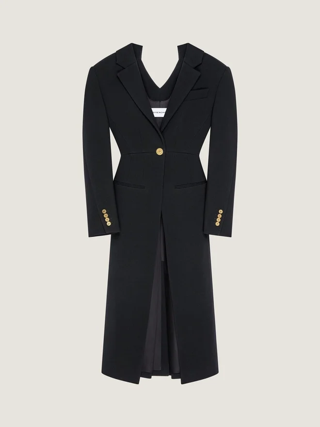 Coat in Wool. Notch Lapel. V Neckline. Slashed in the Back. Single Breasted. Buttoned Cuffs. Givenchy Engraved Golden Buttons.