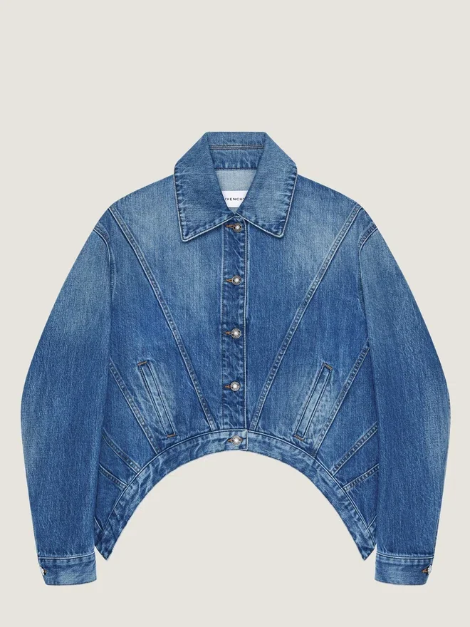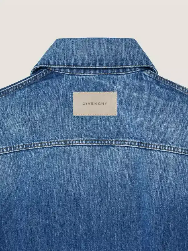 Jacket in Medium Blue Denim with Washed Effect. Classic Collar. Trapeze Shape. Givenchy Suede Patch on the Upper Back. Button