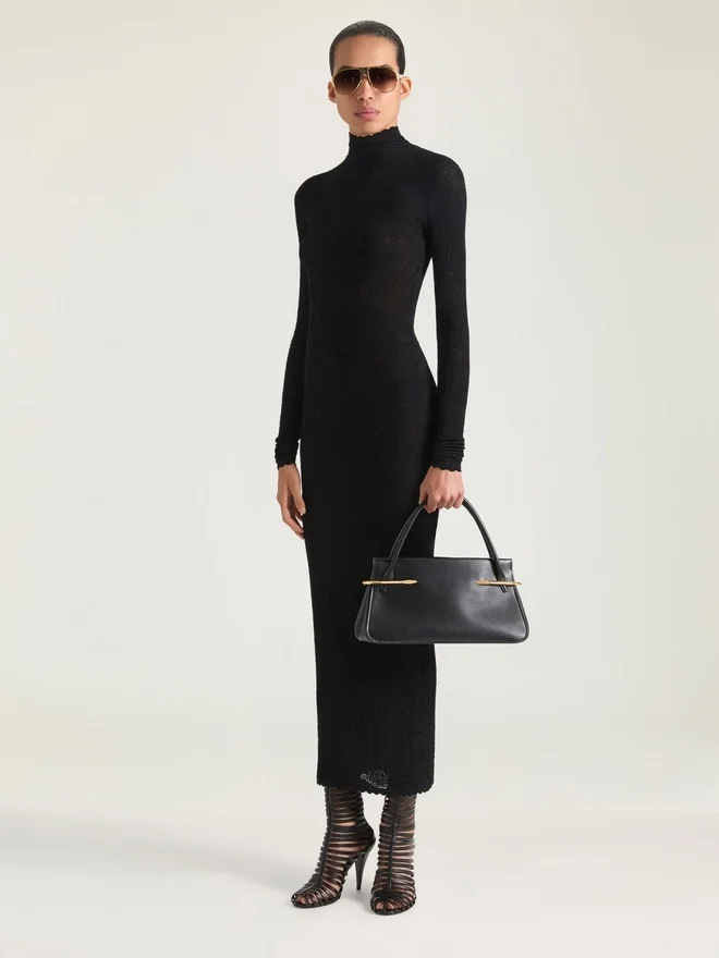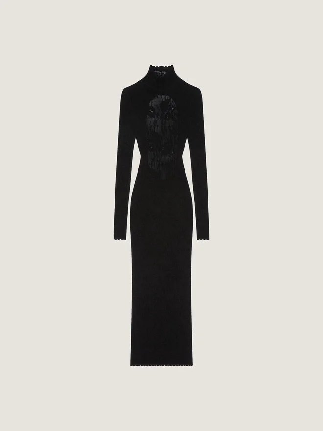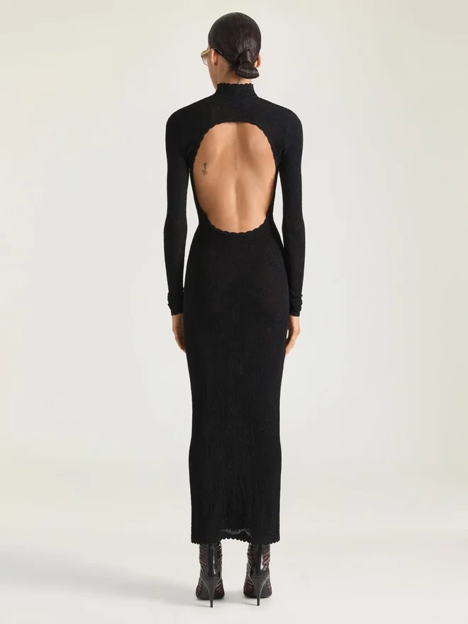 Midi Dress with Long Sleeves in Knitted Floral Lace. High Neck. Open Back. Model Measures 5.8 Feet and Wears a Size S.