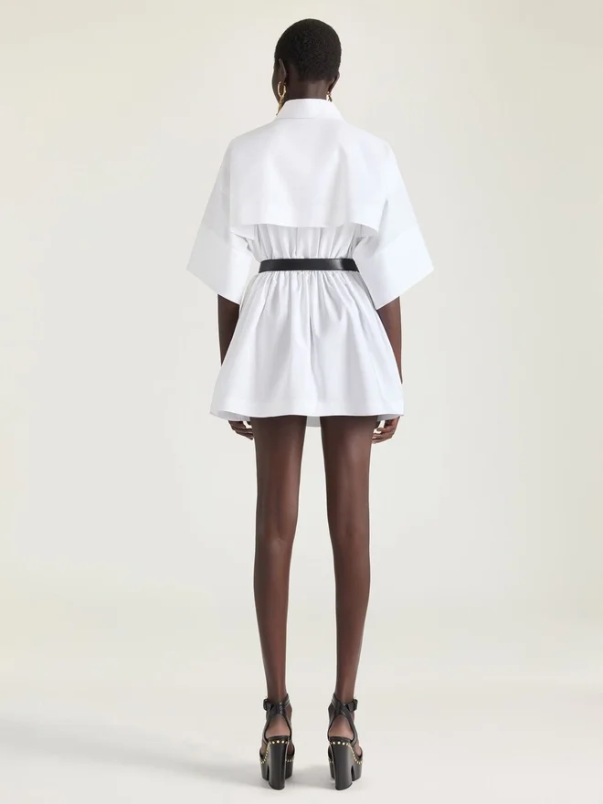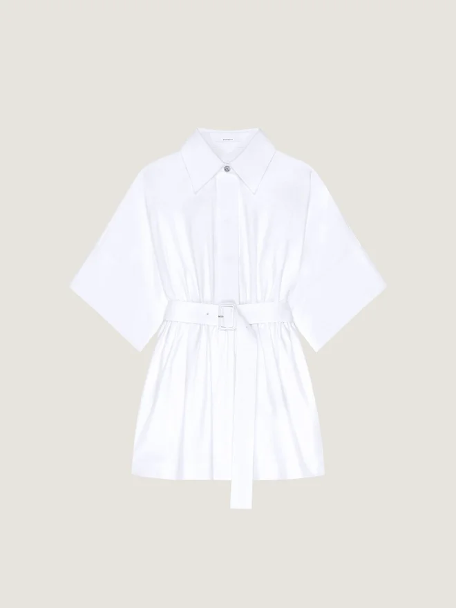 Mini Shirt Dress with Short Sleeves in Cotton Poplin. Classic Collar. Button Closure. Givenchy Engraved Silvery Button. Cape Back