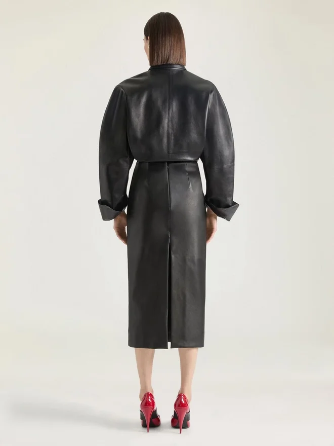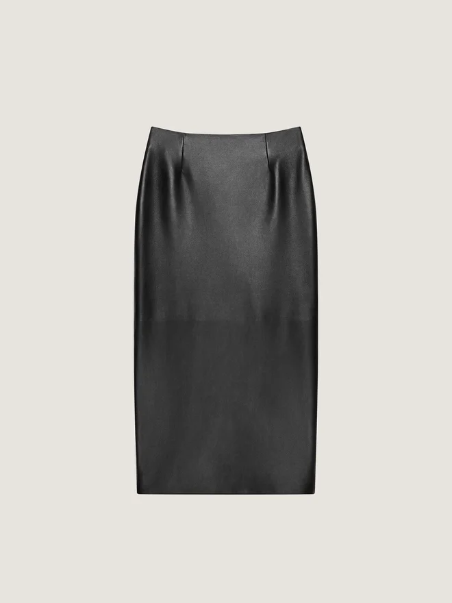 Midi Pencil Skirt in Plonge Lambskin. Invisible Zipped Closure on the Back. Sliced Detailing in the Back. Model Measures 5.8 Feet