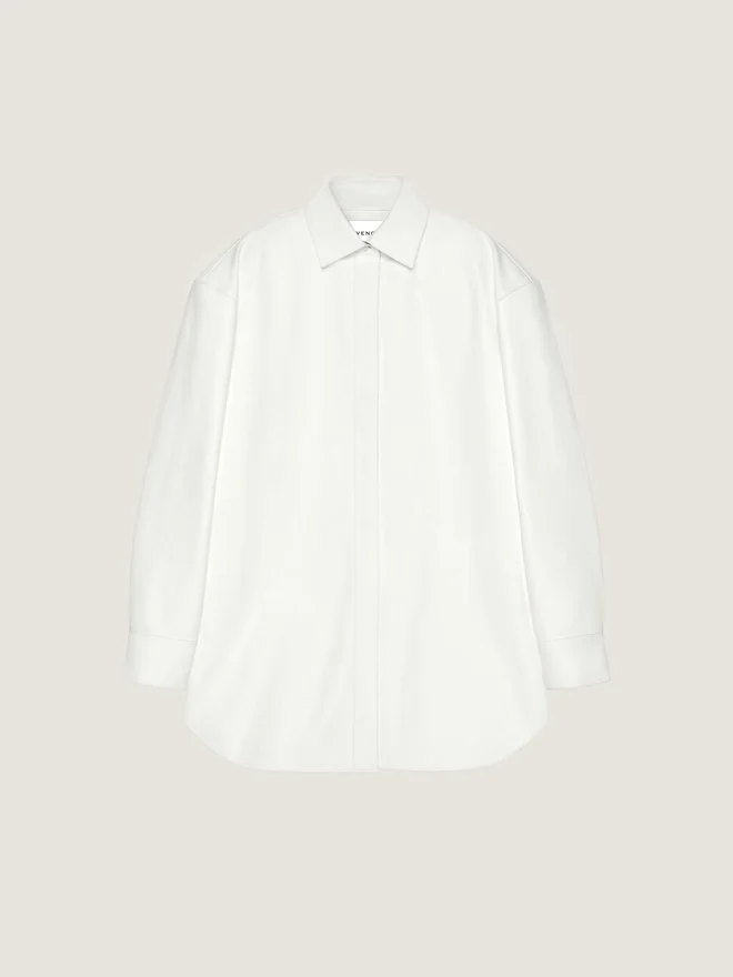 Long-Sleeved Shirt in Nappa Lambskin. Classic Collar. Hidden Button Closure. Buttoned Cuffs. Asymmetric Length: Shorter Back. Can
