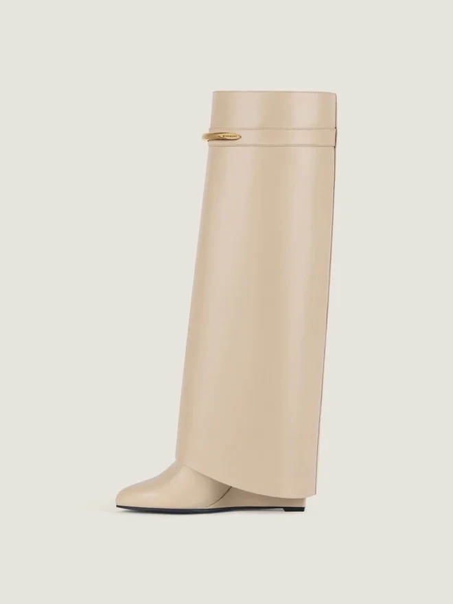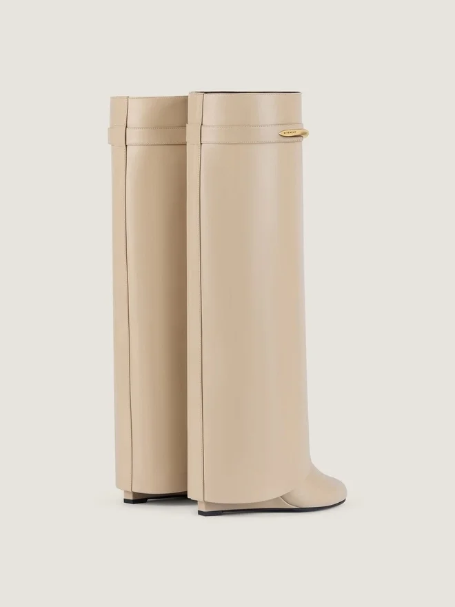 Boots in Calfskin Leather. Shark Pinch Line. Metal Pinch with Givenchy Engraved. Golden-Finish Metal Details. Pointy Toe. Covered