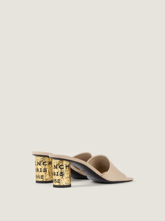 Heeled Mules in Calfskin Leather. Tape Line. Givenchy Label on the Leather Insole. Squared Toe. Thick Heel Covered in Textured